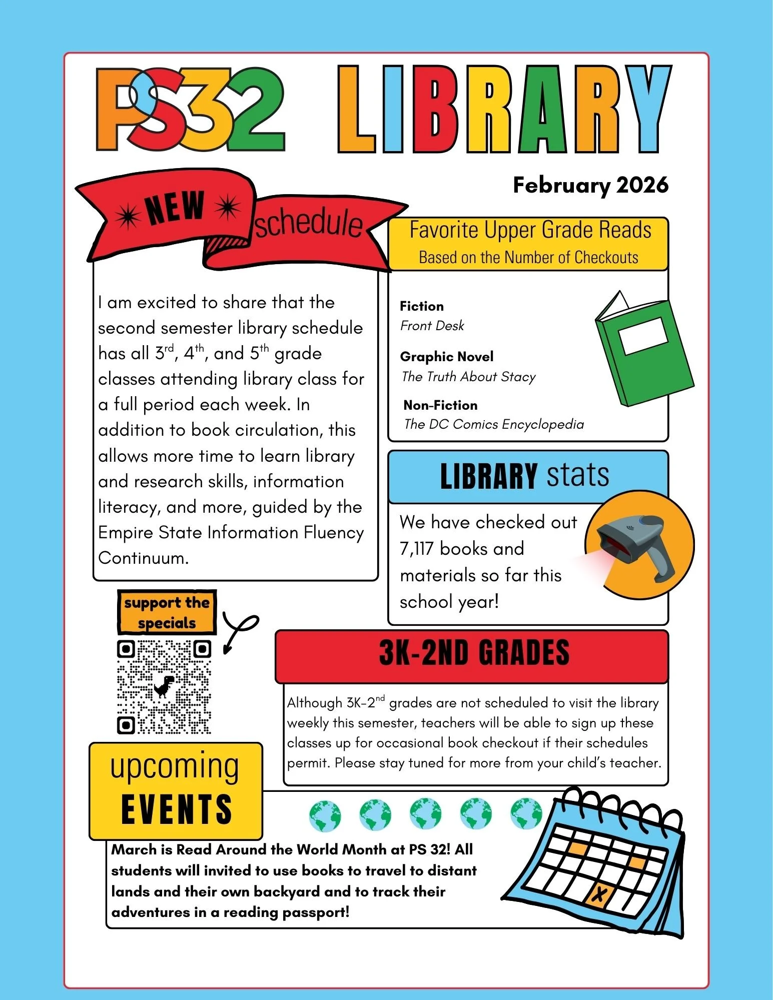 The mission of the PS 32 Library is to inspire joy in reading and learning. Our library fosters a love of reading by encouraging freedom and choice in book selection, connecting with families to build home libraries, and partnering with community organizations to inspire a culture of literacy. The library serves as a welcoming community space for exploration, self-discovery, broadening experiences, and learning of all kinds.